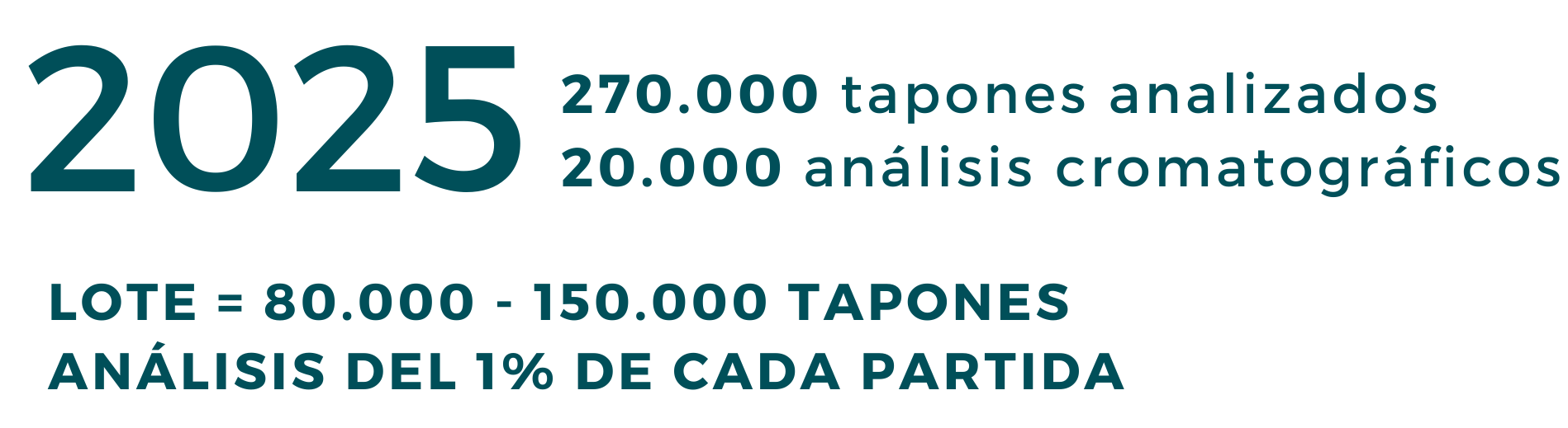 De cada partida, nuestro equipo técnico analiza el 1% de los tapones para asegurarnos la máxima calidad a nivel sensorial. El pasado año realizamos un total de 20.000 análisis cromatográficos, analizando un total de 270.000 tapones.